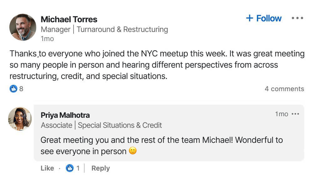 Participants receive an invitation to join the Wharton Online / Wall Street Prep Restructuring & Distressed Investing Certificate Program Group on LinkedIn. Here, graduates can connect with the entire program network, seek advice, and access exclusive online events and resources.